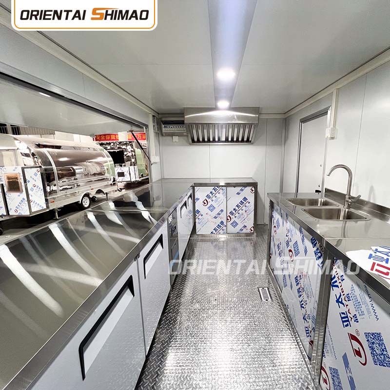 Intérieur en acier inoxydable : L'intérieur est en acier inoxydable, garantissant un intérieur solide et durable, facile à nettoyer et à entretenir et répondant aux normes d'hygiène alimentaire. L'utilisation de l'acier inoxydable améliore non seulement la durée de vie du food truck, mais garantit également l'hygiène et la sécurité du processus de préparation des aliments.