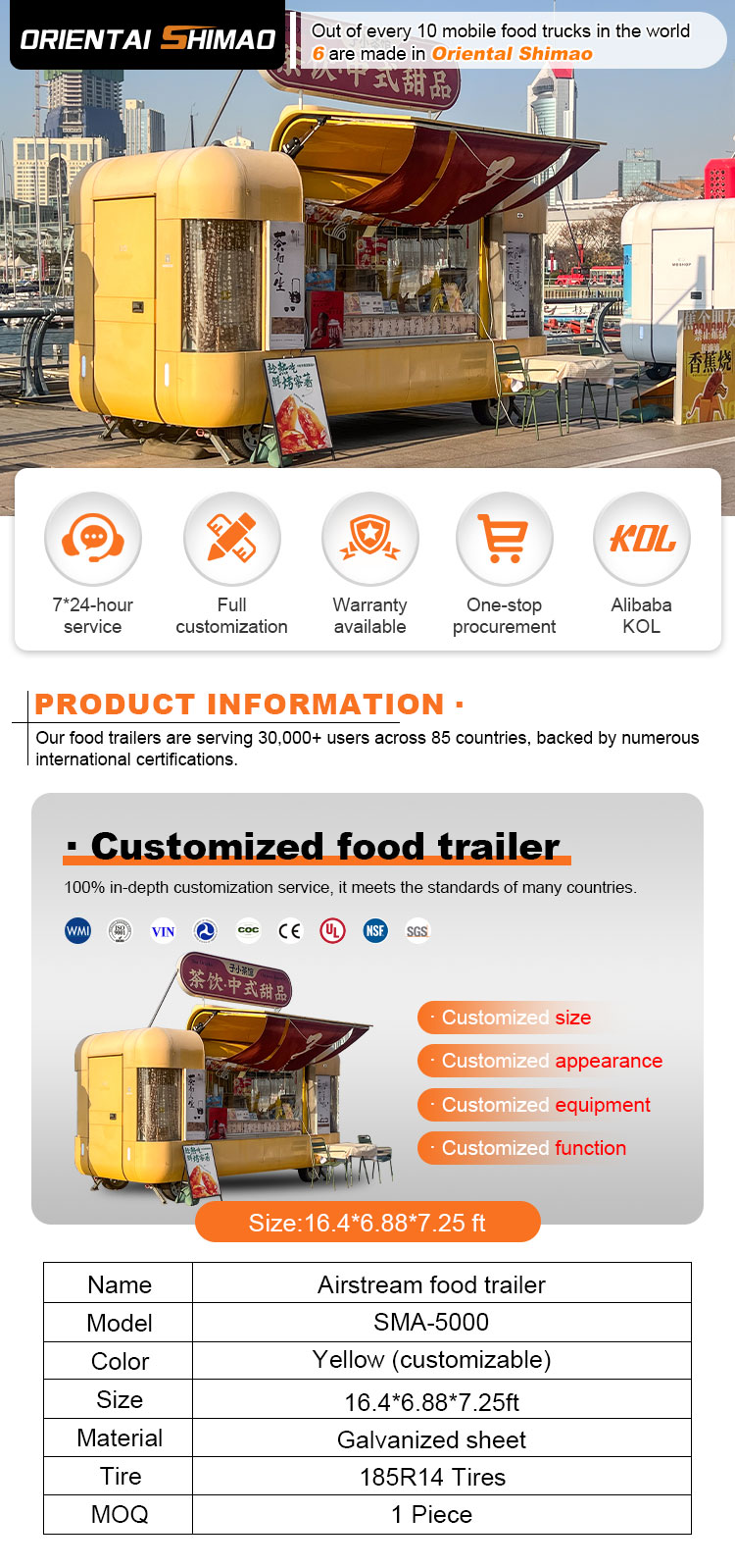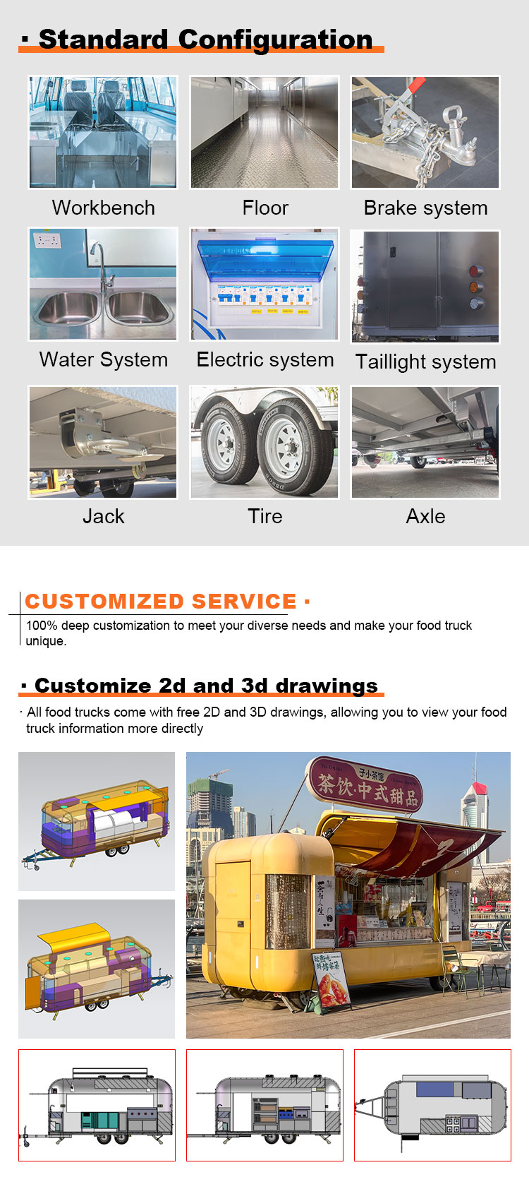 Pour le matériau principal, nous avons choisi l'acier inoxydable 304 de haute qualité, connu pour son excellente résistance à la corrosion et son excellente durabilité, et peut maintenir des performances stables dans diverses conditions environnementales, garantissant que nos produits Coffee Cart Mobile peuvent conserver leur excellente qualité et fonctionnalité même à long terme et faire face à une variété de défis. L'excellente résistance de l'acier inoxydable 304 à la corrosion, de sorte que le camion ne soit pas facilement affecté par l'oxydation ou la rouille, ce qui prolonge considérablement sa durée de vie. L'excellente résistance à la corrosion de l'acier inoxydable 304 rend les camions moins sensibles à l'oxydation ou à la rouille, prolongeant ainsi considérablement leur durée de vie.