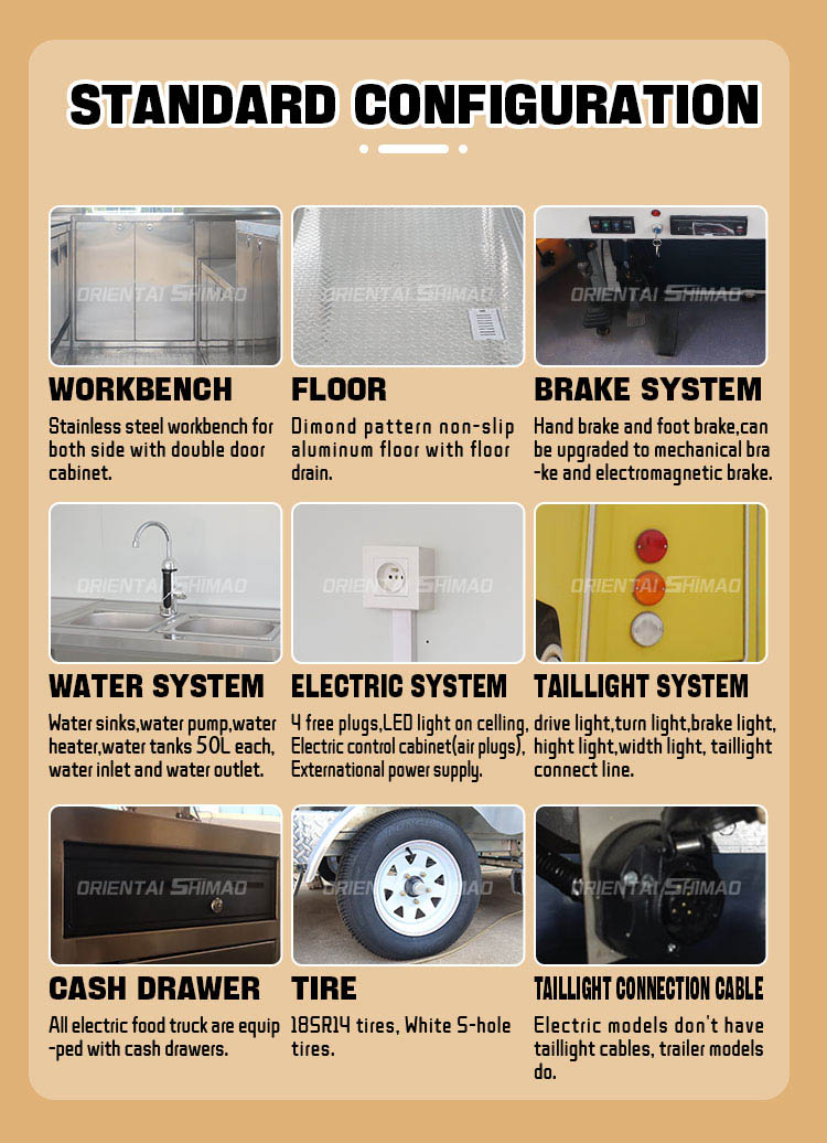 Remorque alimentaire électrique à chaud avec une tôle en tôle en tôle et en fibre de verre galvanisée de haute qualité. La peinture peut être personnalisée avec un établissement spécial requis.