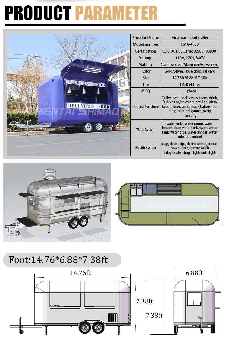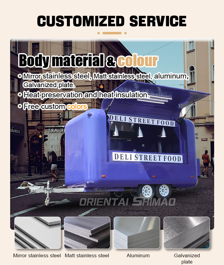 La remorque Van Food Van adopte l'acier inoxydable comme matériau principal, caractérisé par une résistance à la corrosion, une résistance élevée, facile à nettoyer, belle et durable. Sa surface forme une couche dense d'oxyde de chrome, empêchant efficacement la corrosion des métaux et assurant la sécurité alimentaire et l'hygiène. L'acier inoxydable a une apparence brillante, forte et durable, facile à nettoyer et à entretenir, avec un sens moderne, conformément aux exigences de santé environnementale. Par conséquent, les grands remorques alimentaires entièrement équipées sont excellentes, adaptées à la transformation des aliments et à l'environnement de vente, pour répondre à la demande du client de qualité des produits et de normes de santé.