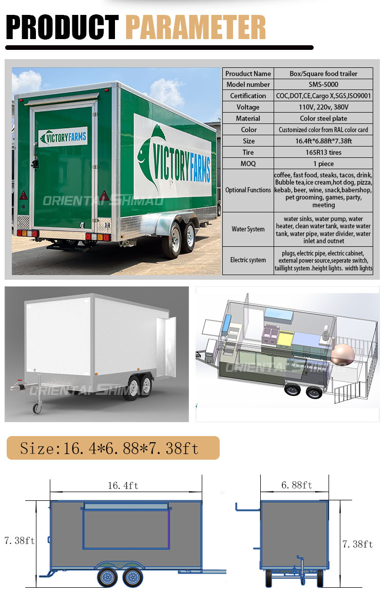 Plus important encore, l’approche commerciale flexible et polyvalente d’Oriental Shimao Franchise-Ready Food Trailer est parfaitement adaptée au rythme en évolution rapide de la vie moderne. Qu'il s'agisse de l'heure du déjeuner dans le quartier des affaires ou des loisirs du soir, elle peut rapidement ajuster sa stratégie pour répondre aux besoins de restauration de différentes personnes à différents moments. Cette adaptabilité sans précédent permet non seulement à Oriental Shimao Franchise-Ready Food Trailer de se démarquer sur le marché hautement concurrentiel de la restauration, mais en fait également une force importante qui stimule l'innovation et définit les tendances dans l'industrie.