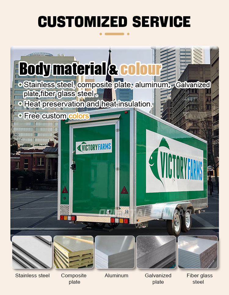 Personnalisation des matériaux : Le choix du matériau est directement lié à la durabilité, à l’esthétique et à la sécurité du food truck. Nous proposons une large gamme de matériaux de carrosserie, de l'alliage d'aluminium durable à la fibre de carbone légère, de l'acier inoxydable classique aux matériaux composites économes en énergie, chacun avec ses propres avantages et scénarios d'application. Parallèlement, nous prêtons également attention aux détails, qu'il s'agisse du matériau des roues, de la robustesse du cadre de traction ou de la commodité du cric, nous le personnaliserons en fonction de vos besoins réels pour garantir que chaque partie du food truck puisse atteindre des performances optimales.