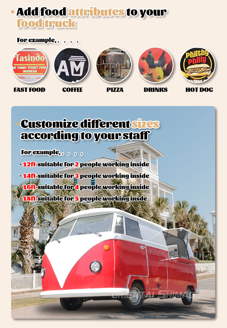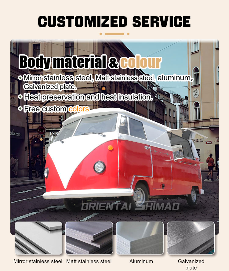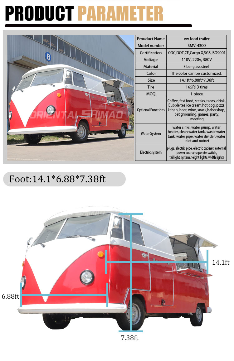 Oriental Shimao High Roof VW Food Truck (modèle: SMV-4300) est une solution de cuisine mobile haut de gamme conçue pour la restauration polyvalente et les applications commerciales. Qu'il s'agisse de nourriture de rue, de boissons au café ou de divers services de restauration, cette remorque vous a couvert. Il est construit à l'aide de matériaux de qualité soigneusement sélectionnés et de processus de fabrication avancés pour s'assurer qu'il offre des performances supérieures et une durabilité durable dans une variété d'environnements. Street Airstream Food Trailer est sans aucun doute le meilleur choix pour les entrepreneurs qui cherchent à faire leur marque dans l'industrie de la restauration mobile.