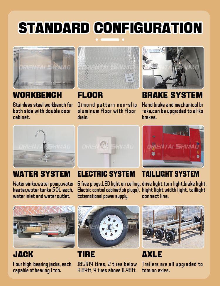 Conception personnalisée: Selon votre type d'entreprise et votre clientèle cible, nous pouvons personnaliser la disposition interne, la configuration de l'équipement et la conception extérieure de votre bande-annonce pour vous assurer qu'elle correspond à votre image de marque et à vos besoins opérationnels.