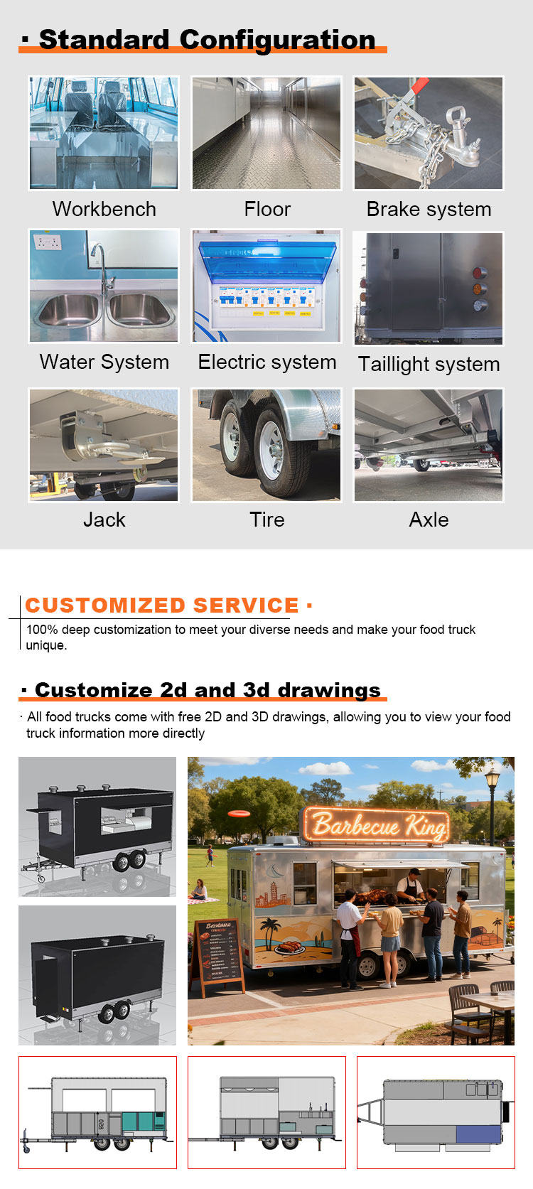 Pour le matériau principal, nous avons choisi l'acier inoxydable 304 de haute qualité, connu pour son excellente résistance à la corrosion et son excellente durabilité, et peut maintenir des performances stables dans diverses conditions environnementales, garantissant que nos produits de remorques de camions de restauration mobiles peuvent conserver leur excellente qualité et fonctionnalité même à long terme et faire face à une variété de défis. L'excellente résistance de l'acier inoxydable 304 à la corrosion, de sorte que le camion ne soit pas facilement affecté par l'oxydation ou la rouille, ce qui prolonge considérablement sa durée de vie. L'excellente résistance à la corrosion de l'acier inoxydable 304 rend les camions moins sensibles à l'oxydation ou à la rouille, prolongeant ainsi considérablement leur durée de vie.