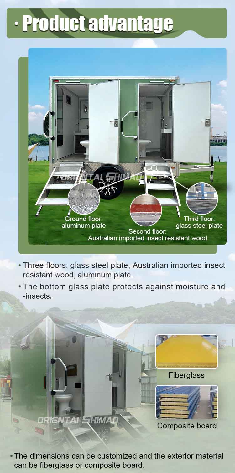 Oriental Shimao Deluxe de luxe respectueuse de la remorque de toilette en plein air est une solution de toilette portable conçue pour répondre aux besoins haut de gamme pour tous les types d'événements à grande échelle, de sites de construction, de camps de plein air et de sites de sauvetage d'urgence. En combinant la technologie environnementale avancée avec une conception conviviale, ce véhicule d'assainissement offre une expérience de toilette confortable, sûre et efficace, ce qui en fait le meilleur choix pour les installations d'assainissement temporaires modernes.