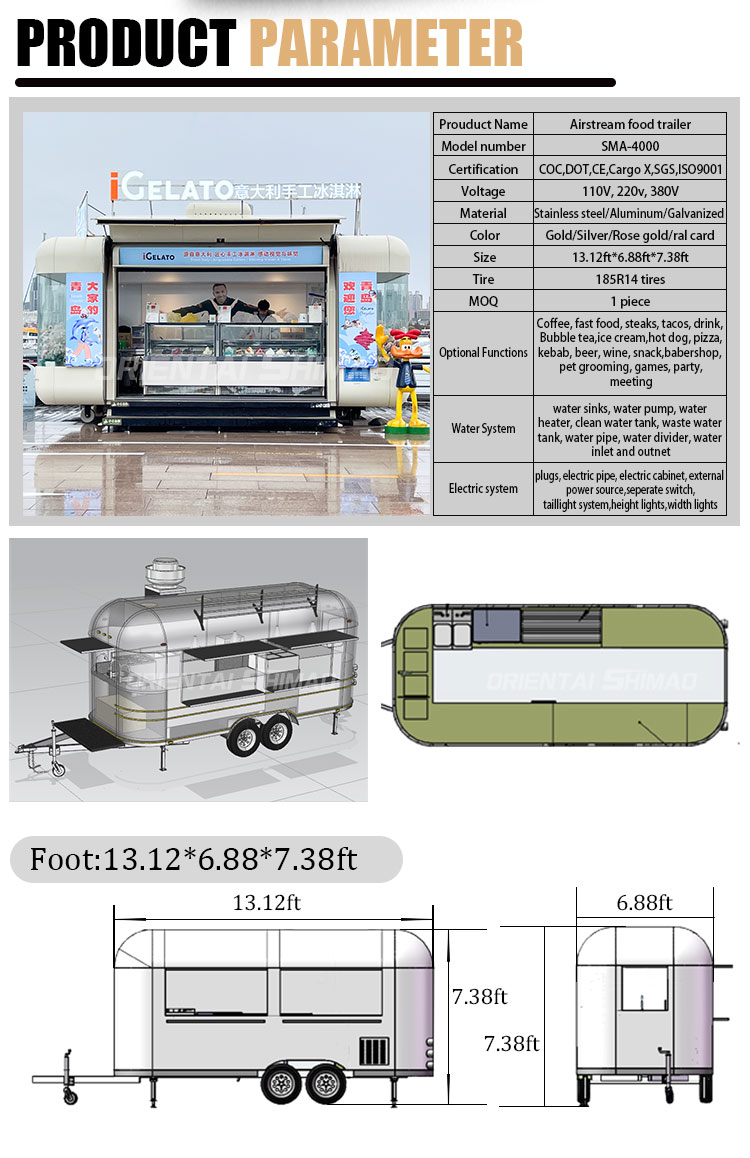 Acier inoxydable doré : l'extérieur du food truck est en acier inoxydable doré de haute qualité. Ce matériau présente non seulement une excellente résistance à la corrosion et à l'abrasion, mais son aspect doré augmente également la beauté visuelle et la sensation de haute qualité, de sorte que le food truck puisse se démarquer dans divers environnements.