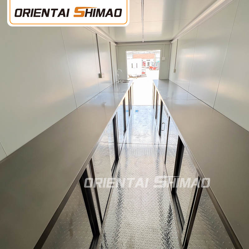 La conception soignée de la structure interne reflète la recherche ultime de la sécurité alimentaire et de l'hygiène. La mousse de polyester remplie dans le sandwich offre non seulement une bonne isolation thermique, afin que les aliments conservent le meilleur goût pendant les saisons chaudes et froides, mais réduit également le poids total grâce à ses caractéristiques de légèreté, ce qui le rend facile à déplacer et à transporter. Il convient également de mentionner que l'espace intérieur est en acier inoxydable, qui est non seulement résistant à la corrosion et facile à nettoyer, mais également efficace pour empêcher la croissance de bactéries, afin que chaque opérateur puisse effectuer facilement et rapidement le travail de nettoyage à la fin d'une journée bien remplie pour garantir que l'hygiène du food truck est toujours la même.
