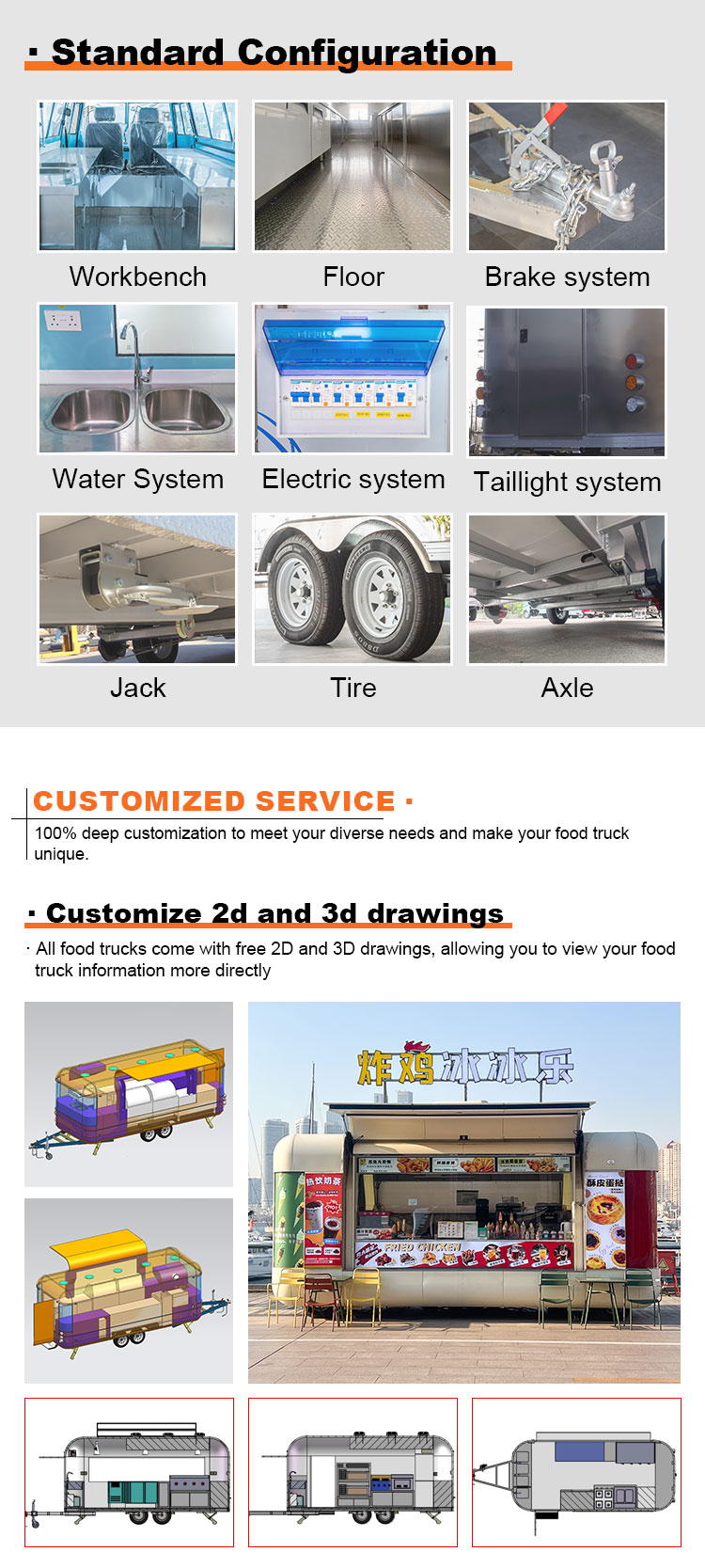 Pour le matériau principal, nous avons choisi l'acier inoxydable 304 de haute qualité, connu pour son excellente résistance à la corrosion et son excellente durabilité, et peut maintenir des performances stables dans diverses conditions environnementales, garantissant que nos produits Pizza Trucks peuvent conserver leur excellente qualité et fonctionnalité même à long terme et faire face à une variété de défis. L'excellente résistance de l'acier inoxydable 304 à la corrosion, de sorte que le camion ne soit pas facilement affecté par l'oxydation ou la rouille, ce qui prolonge considérablement sa durée de vie. L'excellente résistance à la corrosion de l'acier inoxydable 304 rend les camions moins sensibles à l'oxydation ou à la rouille, prolongeant ainsi considérablement leur durée de vie.