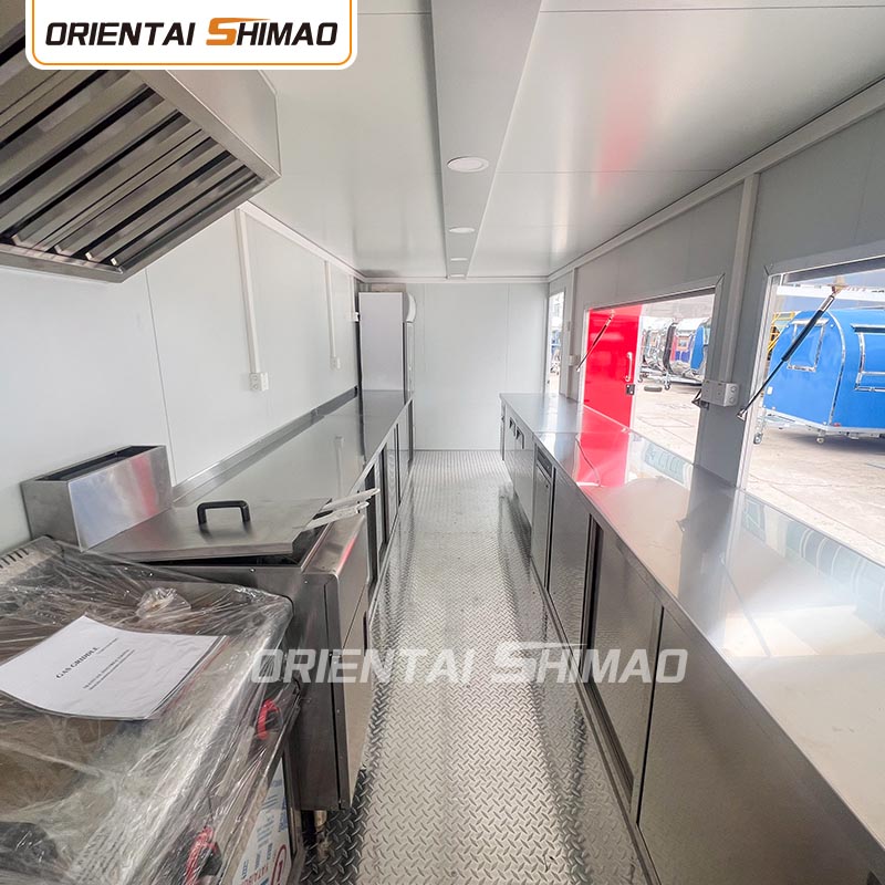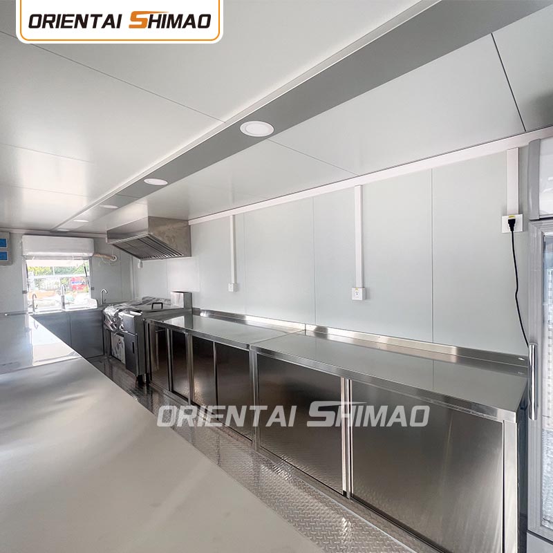 Intérieur en acier inoxydable : L'intérieur est en acier inoxydable, garantissant un intérieur solide et durable, facile à nettoyer et à entretenir et répondant aux normes d'hygiène alimentaire. L'utilisation de l'acier inoxydable améliore non seulement la durée de vie du food truck, mais garantit également l'hygiène et la sécurité du processus de préparation des aliments.